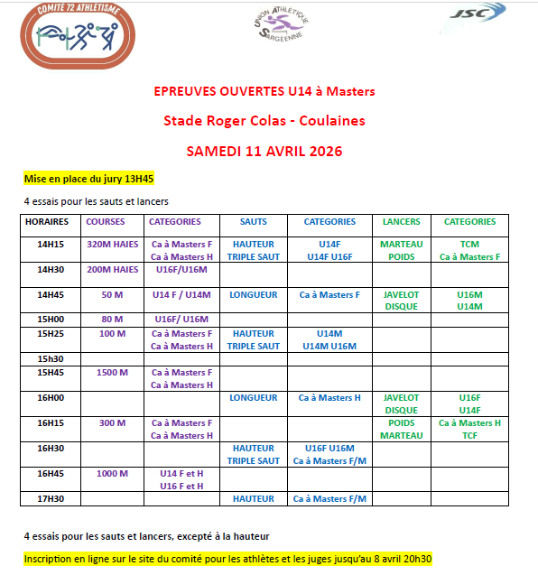EPREUVES OUVERTES U14 à Masters Stade Roger Colas - Coulaines SAMEDI 11 AVRIL 2026