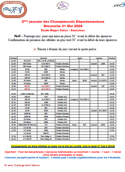 2ème journée des Championnats Départementaux Dimanche 31 Mai 2026 Stade Roger Colas - Coulaines